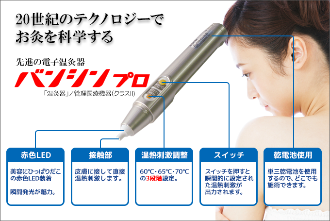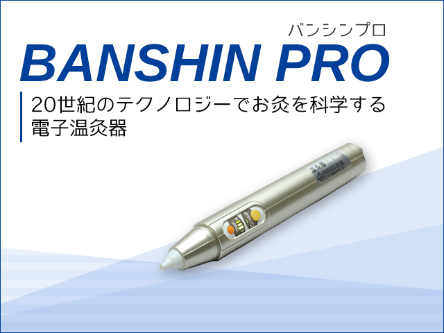 BANSHIN proはスイッチをクリックするだけで温熱刺激を患部に与え、簡単・気軽な経筋病治療を可能にし、幅広く活用できる新しい電子温熱刺激装置です。(バンシン療法研究会HPではお客様の声などを掲載しています。)